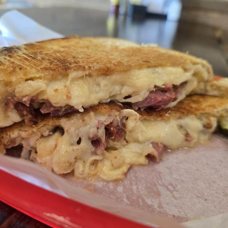 Cheesy J's Twist on a Reuben- House prepared Corn Beef Brisket ,Muenster Cheese ,Swiss Cheese all in house shredded served on our European Wheat Berry Bread grilled to perfection !