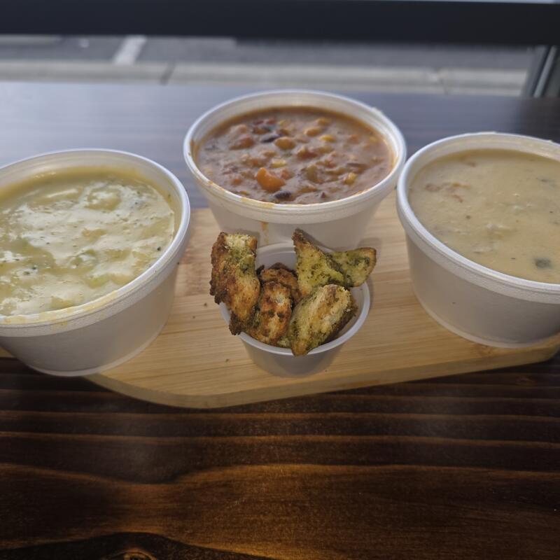 Choose 3 different soups Broccoli Cheddar,Chicken Tortilla,Loaded Potato,Tomato,Brisket Chili All Homemade all together 24 oz of soup pair with your favorite !