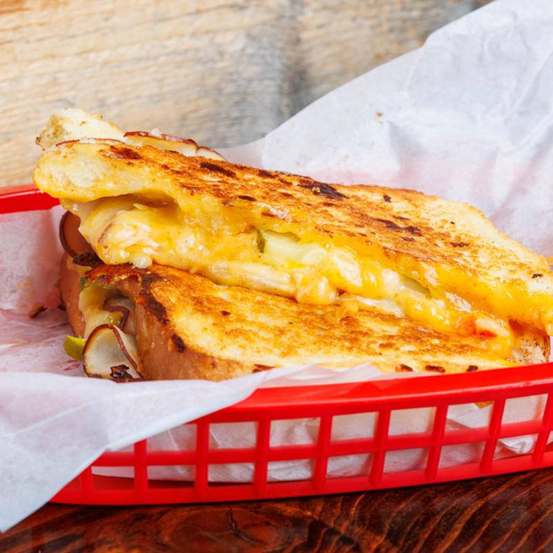 Served on our Texas Toast House Mac &Cheese,Muenster,Cheddar Grill Cheese to die for Melty Goodness!
