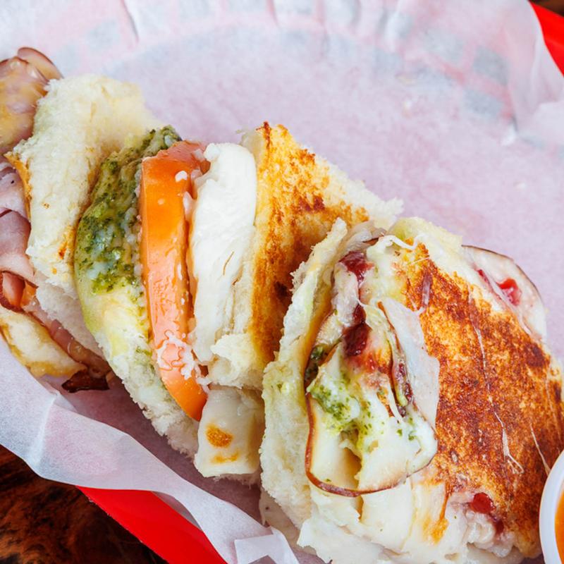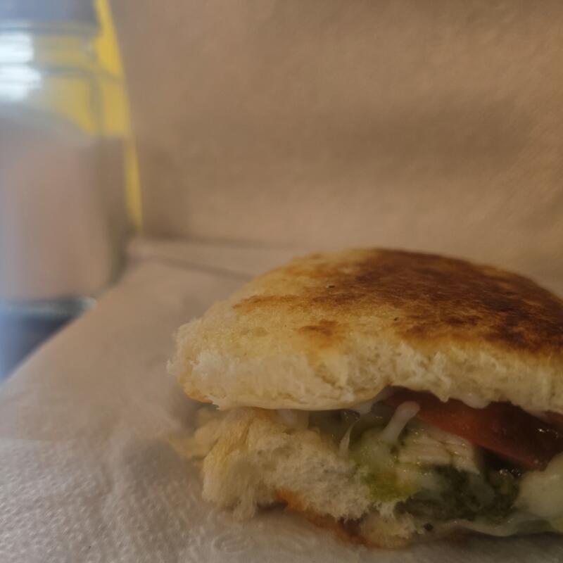 Chicken breast ,Pesto,tomato,Mozzarella cheese on a Hawaiian roll