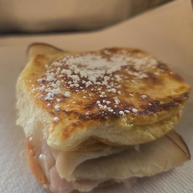 French toasted bread with Oven roasted Turkey,Honey Cured Ham Covered with powder sugar served with a side of Maple Syrup
