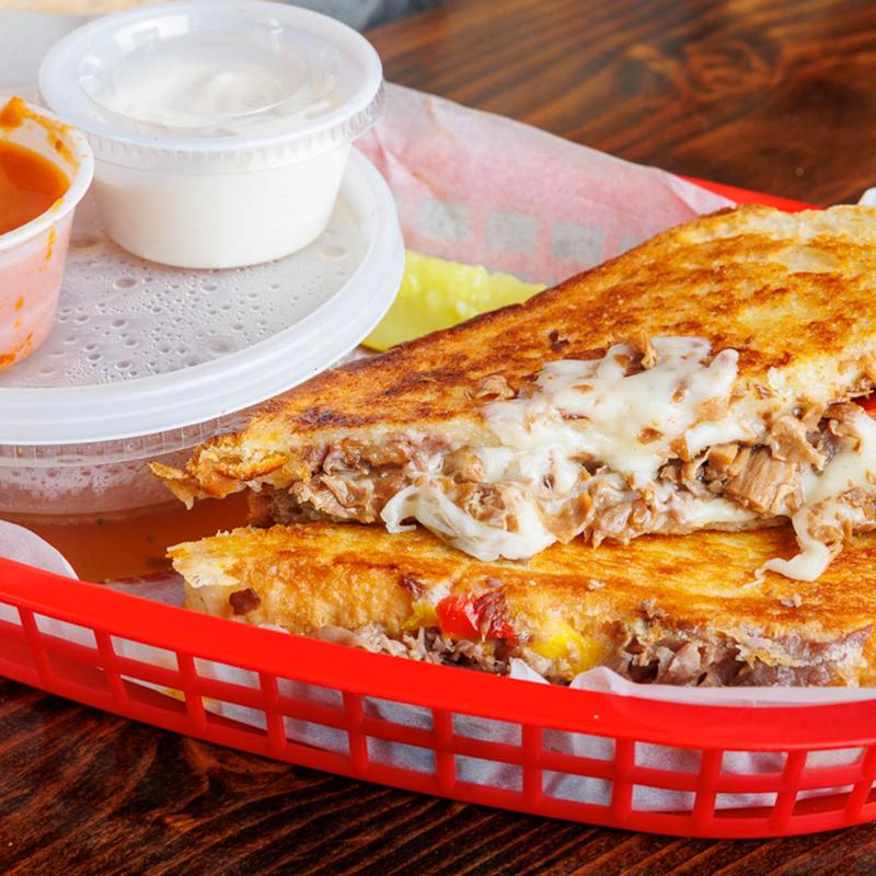 Sour Dough Bread, Prime Italian Roast beef slow cooked,Swiss,onions &peppers served with Au Jus and horseradish.
